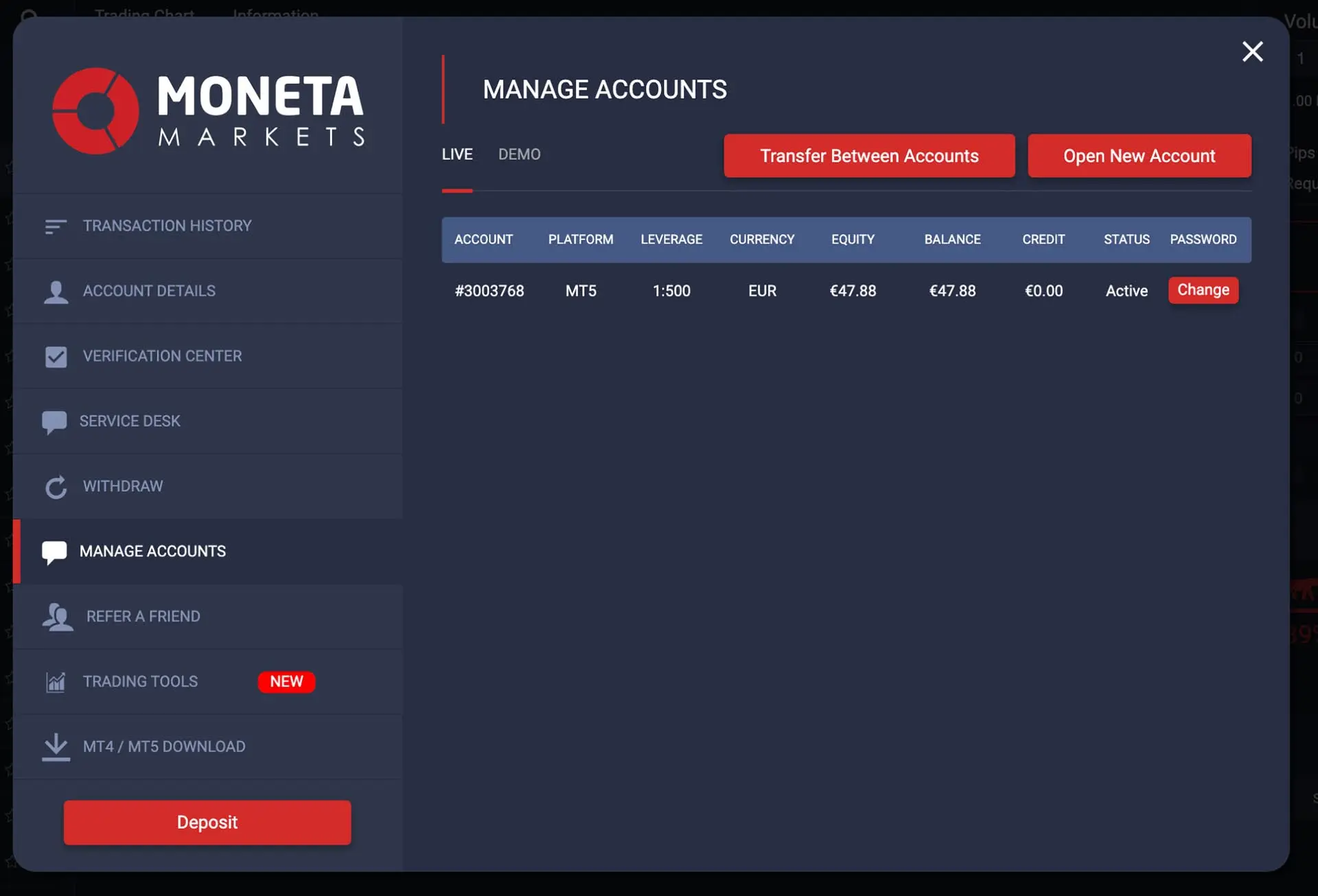 This is the metric to determine if your Hard Stop has been hit and is worth monitoring appropriately. Drawdown will not take in account trades placed by the client themselves nor deposits or withdrawals. If a deposit or withdrawal is made then your max drawdown will need to be reset to adjust to the new balance.